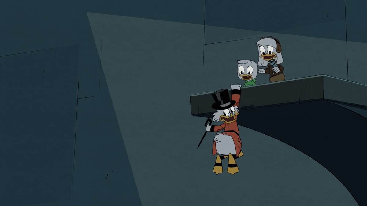 What follows is a sequence of escalating action and comedy setpieces, one after another, that highlight each group’s abilities to adapt to and overcome these scenarios. At the mansion, Webby is tasked with catching the nephews by surprise, which she of course does over and over again with ease. It turns out her spy skills are beginning to rival her grandmother’s, which is why that particular storyline ends with a faux-showdown between the two on the roof of the building. At the Money Bin, Scrooge forgets his own password to the security system and locks himself out of giving it commands, which means he and his two relatives locked inside must find a way out while surviving its increasingly deadly booby traps.