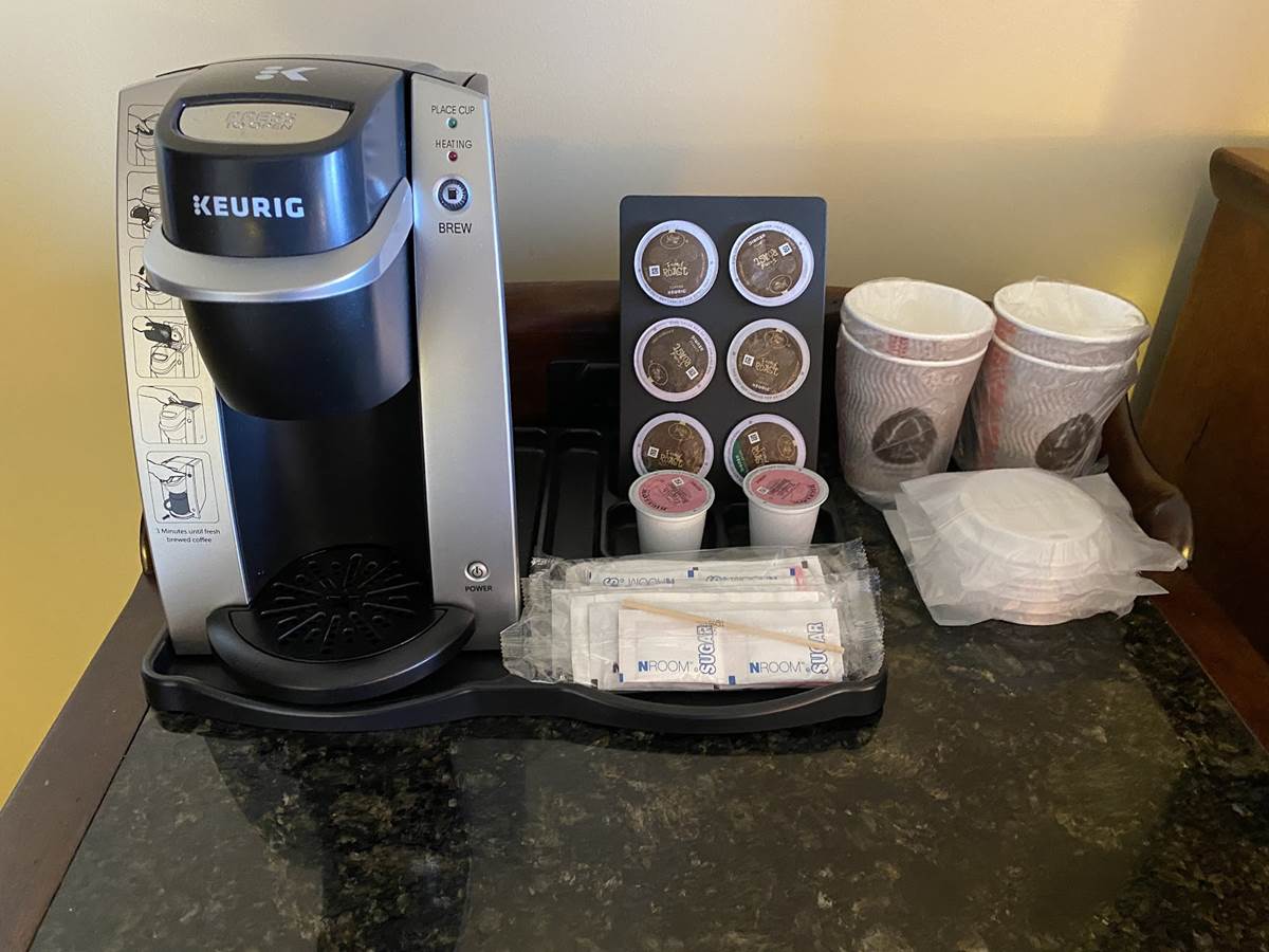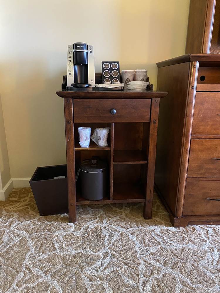 A mini-fridge is in the center of the TV cabinet and next to it is a coffee station. Each room has a Keurig coffee maker and is stocked with coffee and tea pods from Joffrey’s.