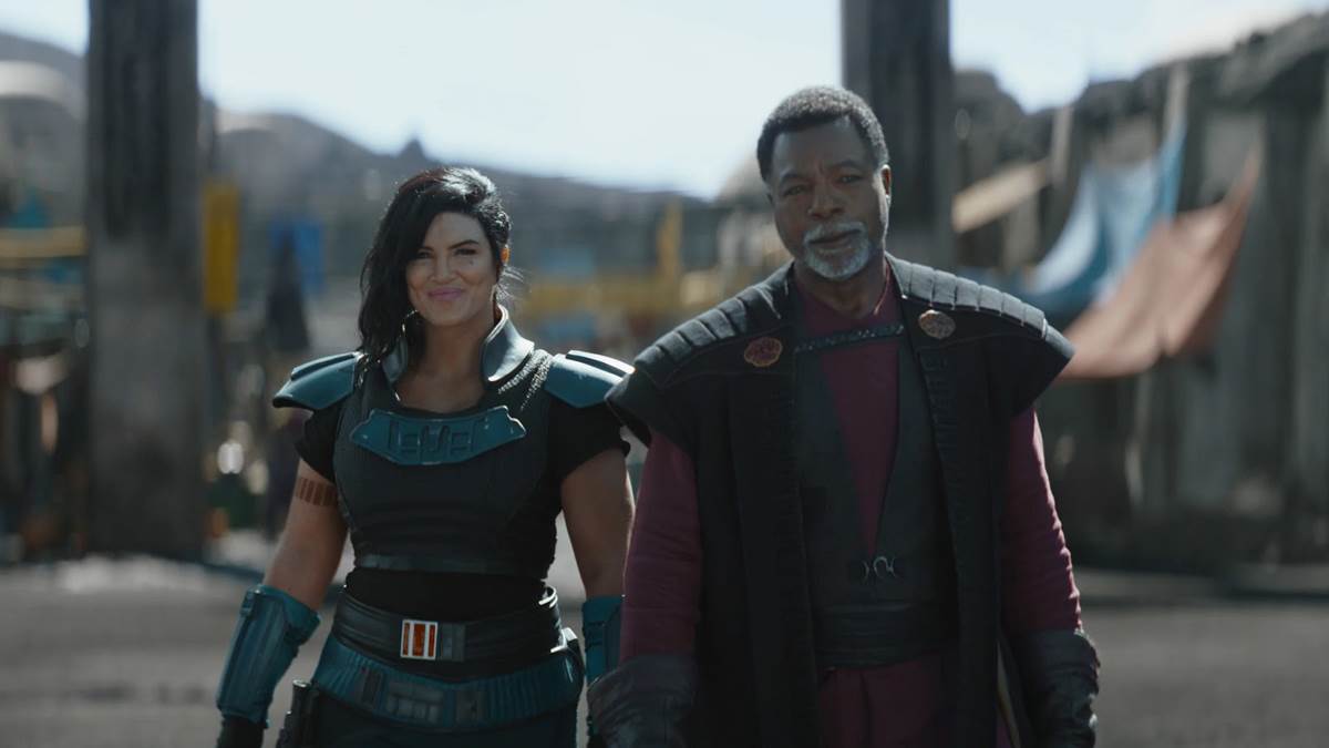 Limping through space after the events of the past few episodes have left the Razor Crest in shambles, Mando (played by Pedro Pascal) attempts to enlist The Child’s help in repairing the ship, with predictably amusing results. Our hero realizes he and his companion are not going to make it to Corvus to meet with Ahsoka Tano in their current condition, so he decides to make a pit stop back on Nevarro, where former Rebel Alliance shock trooper Cara Dune (Gina Carano) has been cleaning up the main settlement by taking out local Aqualish thugs.