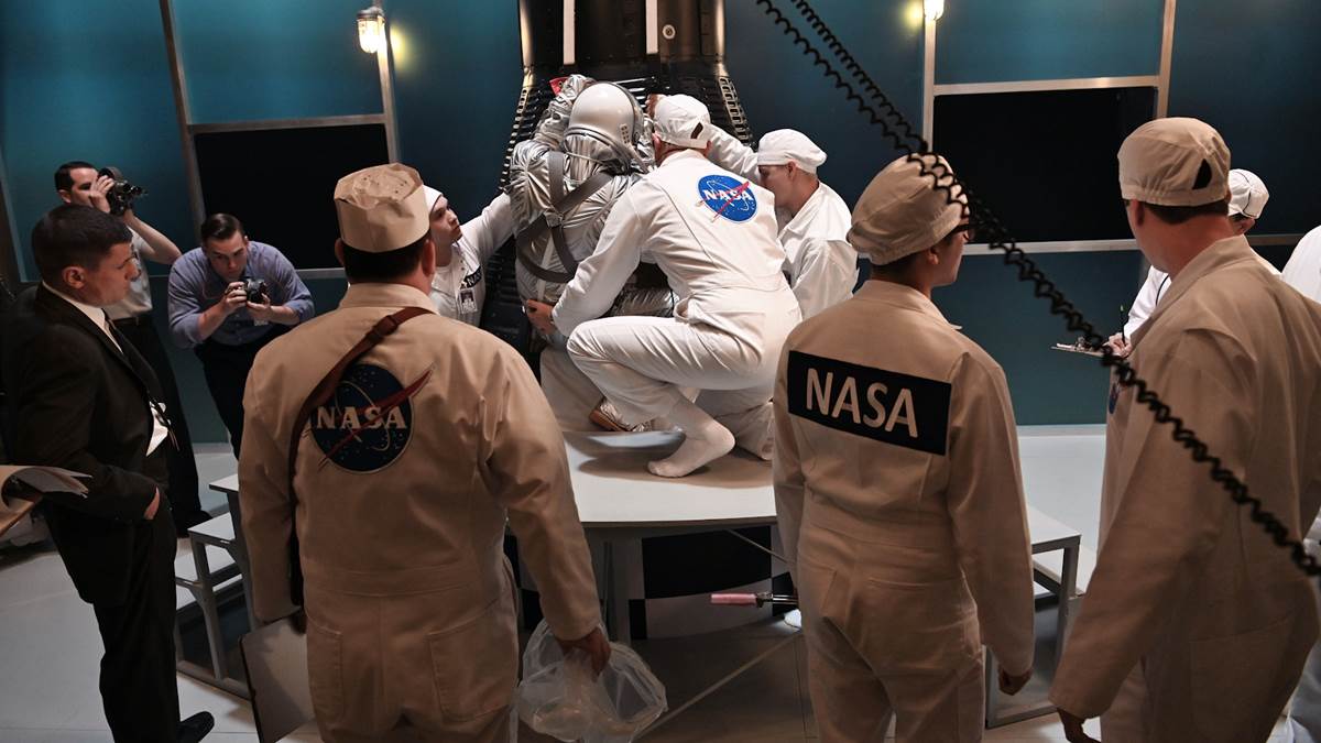 Episode 8 of The Right Stuff opens on May 5, 1961. It’s the early hours of the morning and Alan Shepard (Jake McDorman) is being escorted to his Mercury capsule ‘Freedom 7’. Strapped into the capsule, Shepard thanks Gus Grissom (Michael Trotter) and makes peace with John Glenn (Patrick J. Adams) before being sealed into his seat.