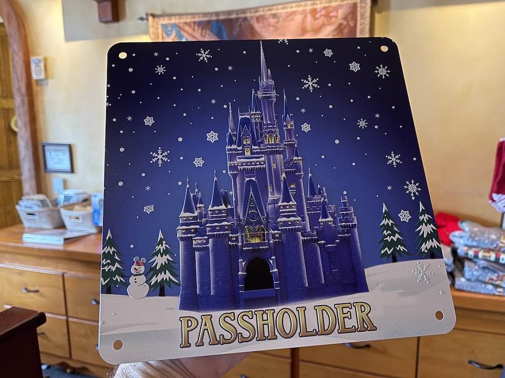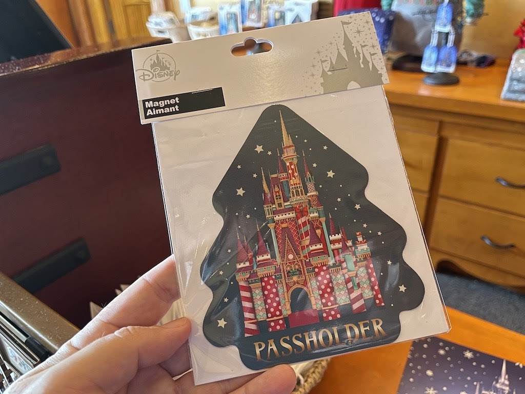 Fans will love the Christmas tree-shaped magnet that serves as the backdrop of a colorful, candy coated Cinderella Castle. Snowflakes give the scene a whimsical touch, and below the image is the word “Passholder” in all capital letters. This castle design is similar to the look on the phone case.