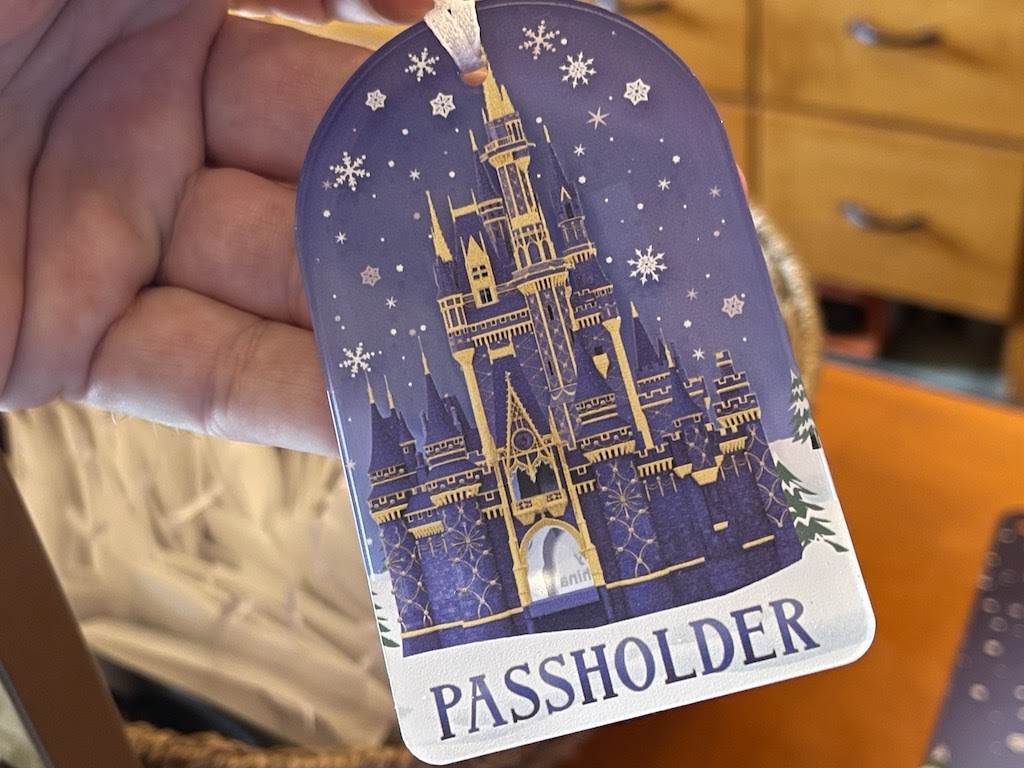 The passholder ornament showcases Cinderella Castle in beautiful blue and gold and surrounded by snow. Brilliant white snowflakes dot the background and bring an elegance to the scene.