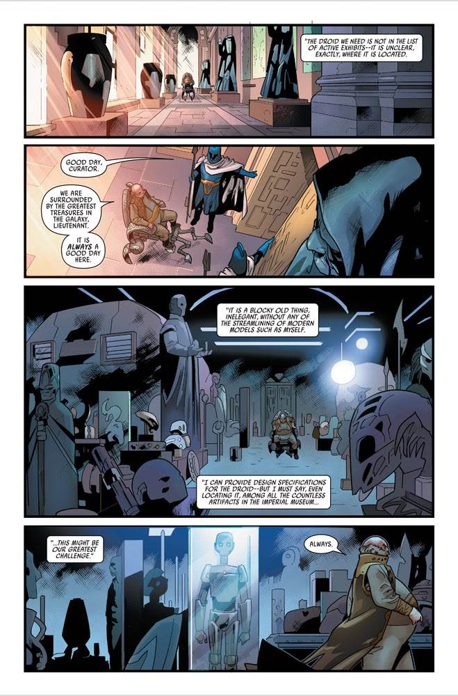 Naturally the curator of said museum isn’t the nicest guy in the galaxy, but Leia assembles a crack team to travel to the Imperial-controlled city-planet as a plan of attack. Yeah, it’s another heist story in a Star Wars comic, but at least the crew put together here is an interesting one: we get to see the SpecForce Pathfinders in action-- Kes Dameron (Poe’s father) and a couple cool-looking aliens called Needle and Frell-- alongside poor Lando Calrissian (who wishes he could be anywhere else) and his buddy Lobot, who has the tools and knowhow to hack into the museum’s computer. As you might guess, the scheme doesn’t go perfectly, but it’s fun to see what these characters are capable of in this kind of situation regardless.