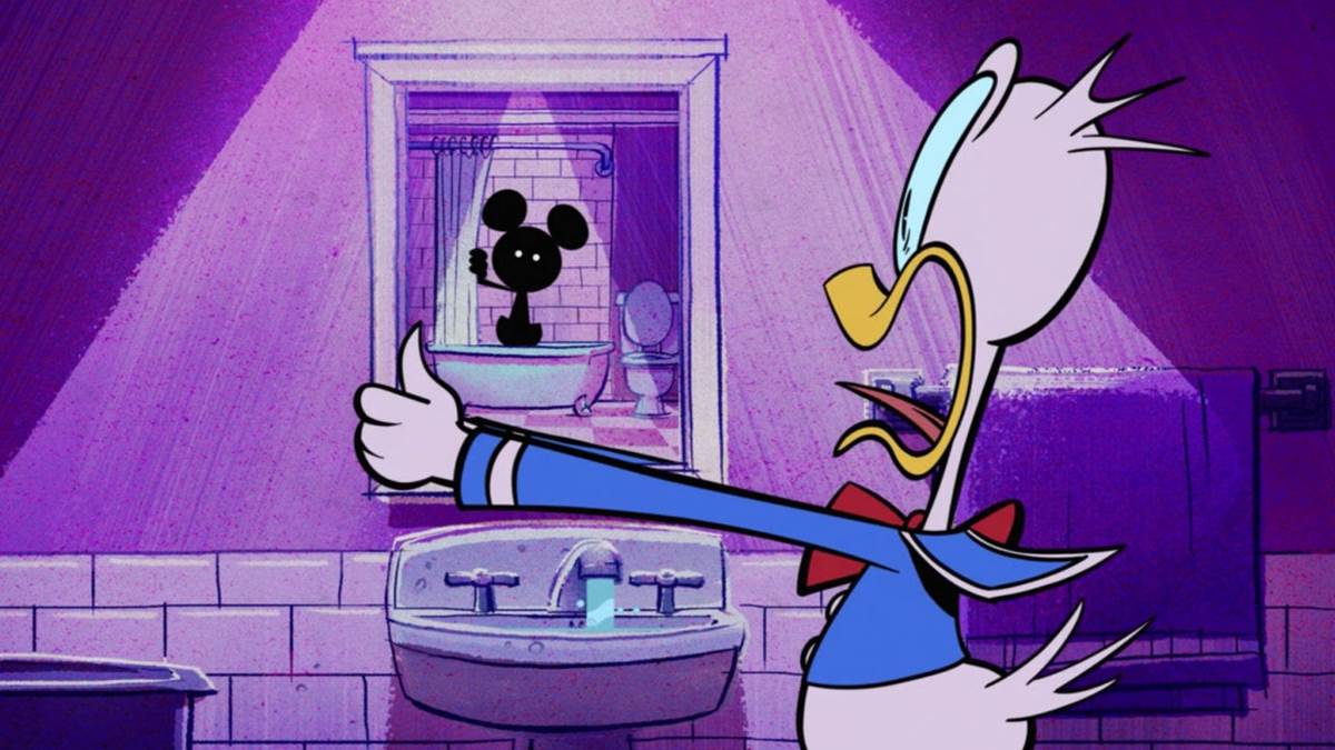 Mickey finds Donald in the bathroom, causing him to jump out the window and join Daisy on a cold, rainy night.
