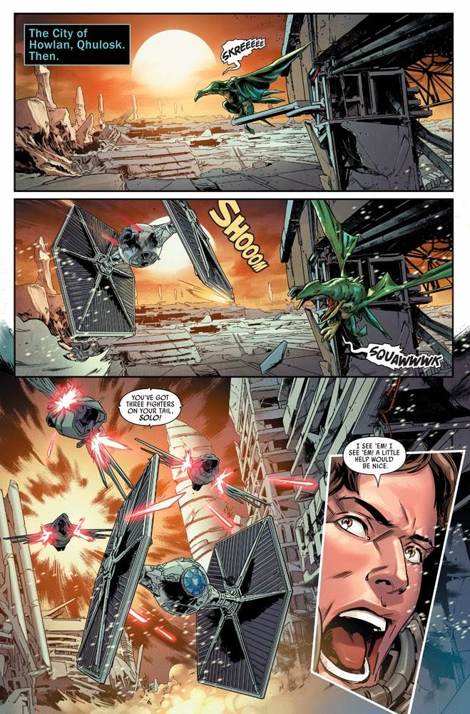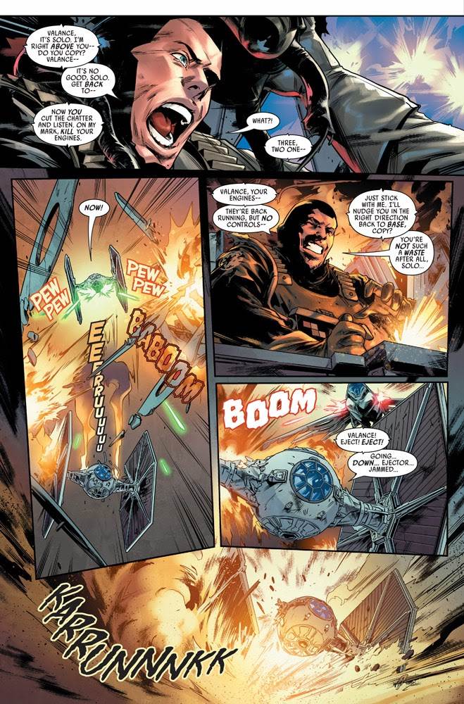 Issue #8 of Bounty Hunters begins a new story arc for the title, entitled “The Terminus Gauntlet,” with this initial chapter being called “Moving Target.” Writer Ethan Sacks starts off with a surprise flashback to bounty hunter Beilert Valance’s time serving as a TIE fighter pilot alongside a young Han Solo in the Imperial Academy (previously glimpsed in the 2018 Han Solo: Imperial Cadet comic miniseries). Valance feels abandoned by Solo and his fellow wingmates after crashing on the planet Qhulosk, but due to that experience learns he needs to fight for his own survival in such a dangerous galaxy.