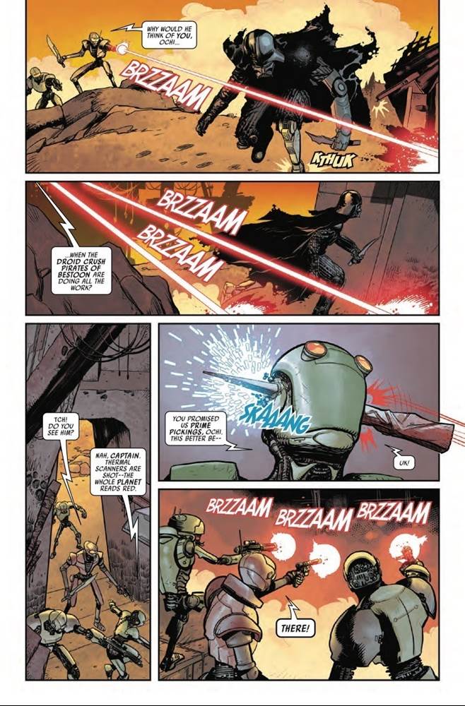 Ochi has sicced a squad of killer robots called the Droid Crush Pirates of Bestoon on Vader, and they spend the issue being thwarted by the Dark Lord at every turn, despite their boasts of superiority and put-downs of Vader’s inferior cybernetic technology and vulnerable organic underbelly. Naturally ol’ Darth makes quick work of these mechanical menaces, despite Emperor Palpatine forbidding him from using his Force powers to escape Mustafar earlier in this arc, not to mention the droids’ attempts to prey on Vader’s psychological insecurities during the battle. And midway through, Vader manages to reclaim his lightsaber from Ochi and wreak havoc on the remaining droids, which was pretty entertaining to see as far as action sequences go.