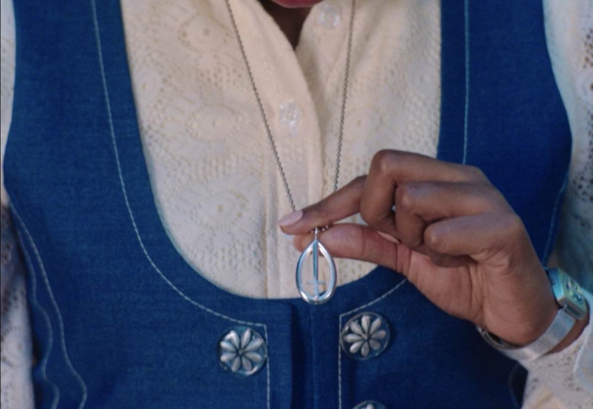 Fans tuning into the series will immediately recognize this necklace as the one worn by Wanda’s neighbor Geraldine aka Monica Rambeau in the third episode “Now in Color.” So what’s so special about this item? Well the symbol represents the logo for S.W.O.R.D. which in the Marvel Cinematic Universe stands for Sentient Weapon Observation and Response Division.