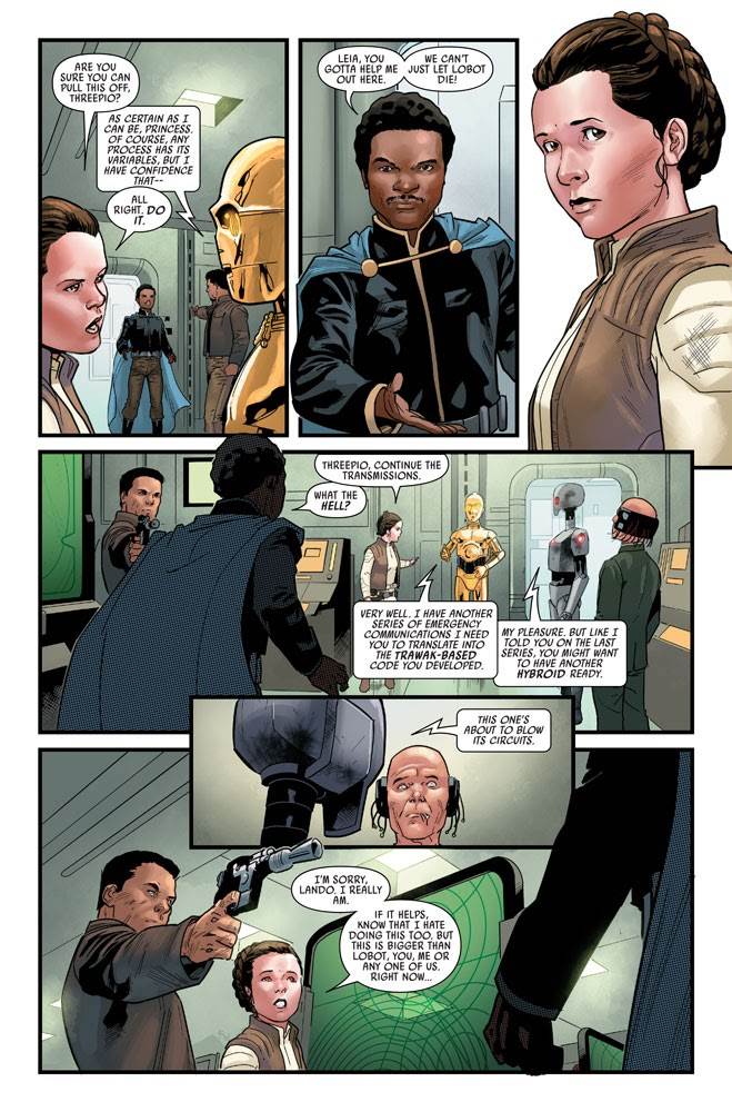 Two deadly standoffs break out in Star Wars #11, which came out today from Marvel Comics. First, Lando Calrissian demands that Kes Dameron (Poe’s father), Princess Leia Organa, and C-3PO release his friend Lobot, who is in danger of having his cyborg brain fried by the ancient droid they’re using to create a new rebel code.