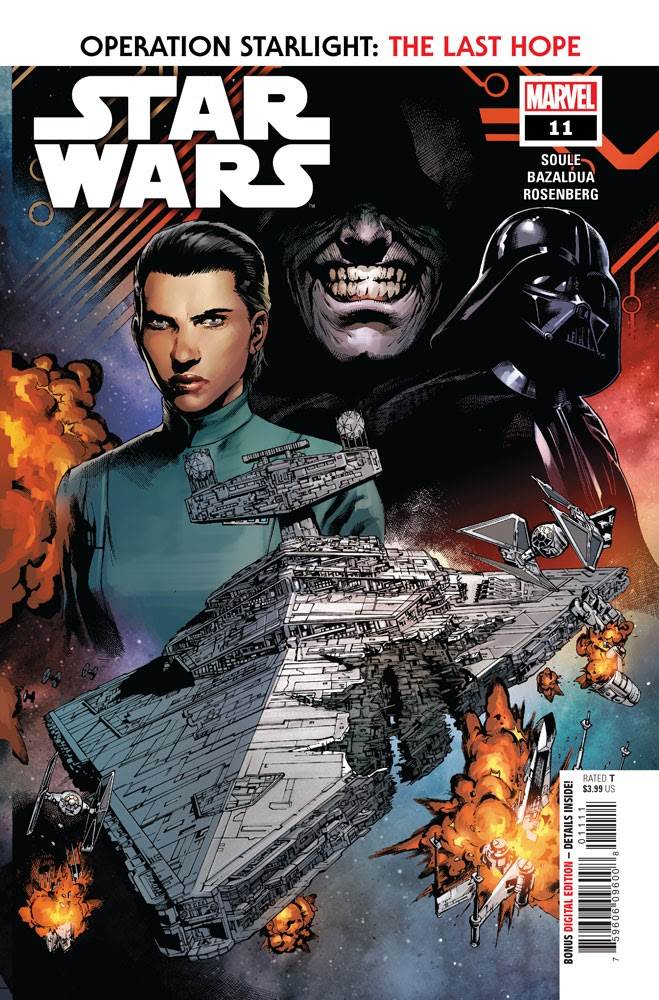 Tensions run high in both simultaneous conflicts, and we start to understand why the Lando of this timeframe (set between the events of The Empire Strikes Back and Return of the Jedi) is more willing to betray the rebellion than he is later on. The showdown between him and Dameron comes to blows with Lobot’s life hanging in the balance as Leia desperately tries to reach out to Starlight Squadron via Threepio. Trapped in the Star Destroyer’s hangar bay, Wedge, Shara, and the Duros L’ulo L’ampar come up with a plan to use the Empire’s own tech against them, while the devious Commander Zahra barks orders from the capital ship’s bridge. The characters of Darth Vader and Emperor Palpatine, both pictured on this issue’s cover, sadly do not appear in the story.