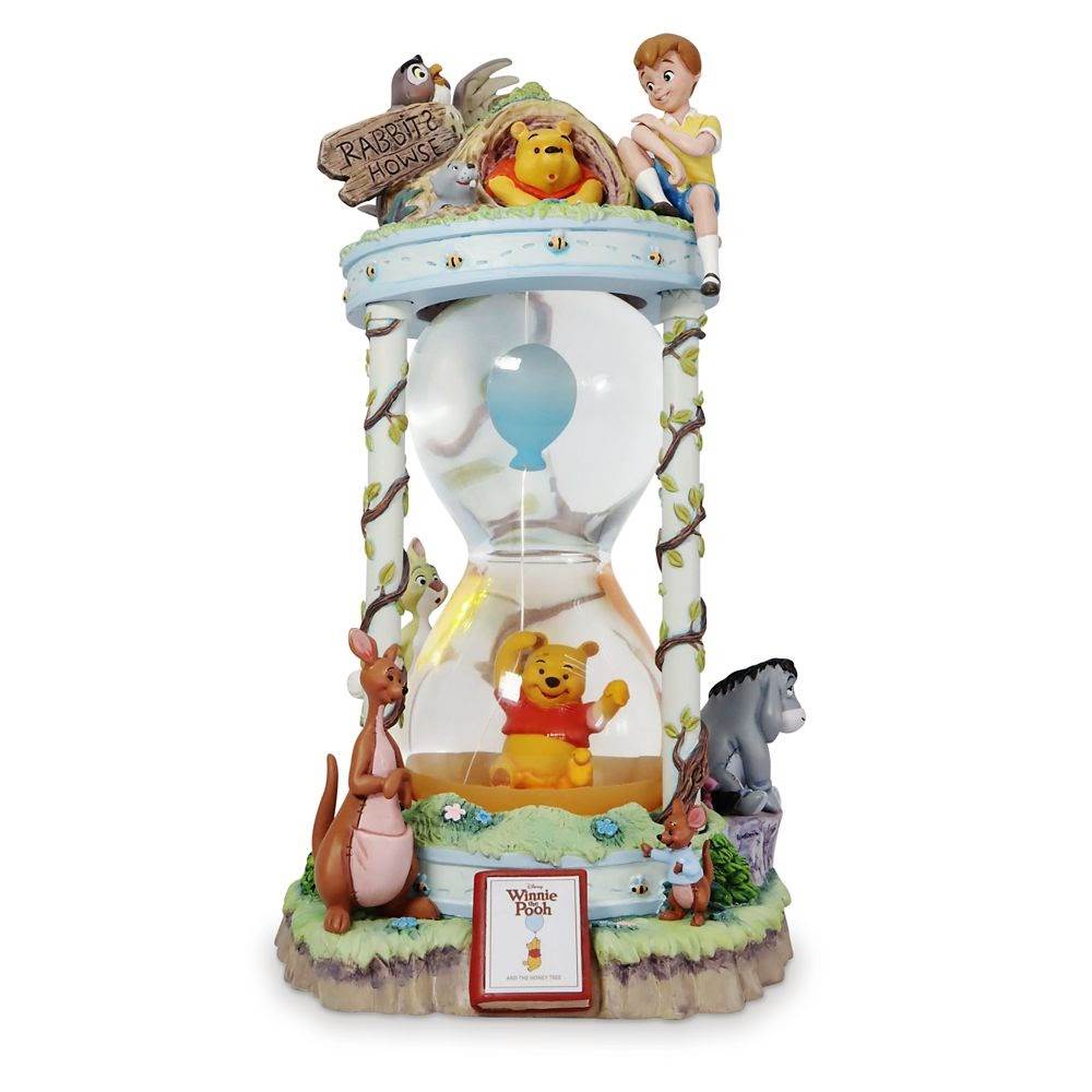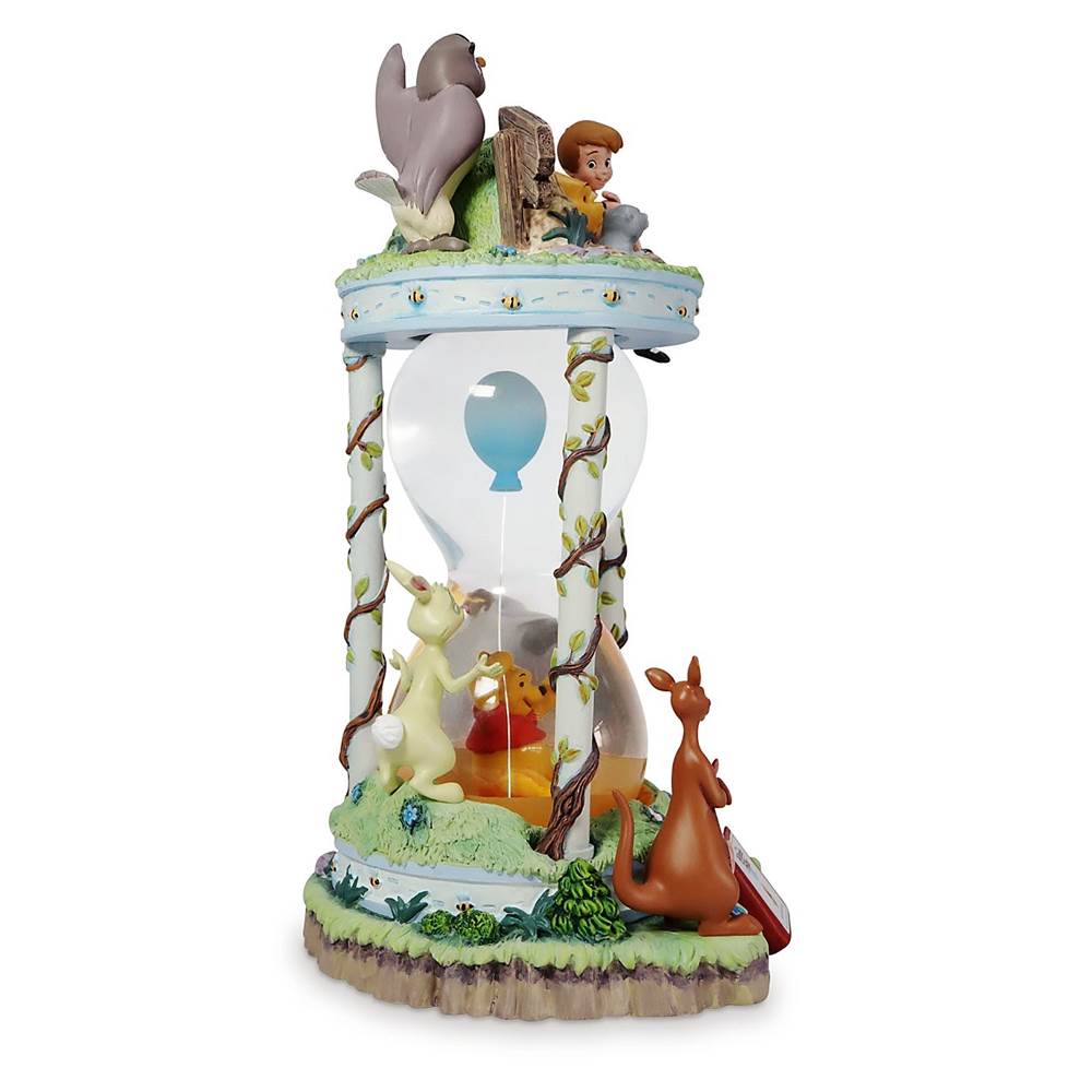“Celebrate the 55th anniversary of Winnie the Pooh and the Honey Tree with this finely detailed, fully sculpted hourglass featuring a splendiferous cast of characters. Turn the hourglass to see the sand flow around Pooh who sits inside holding a blue balloon.”