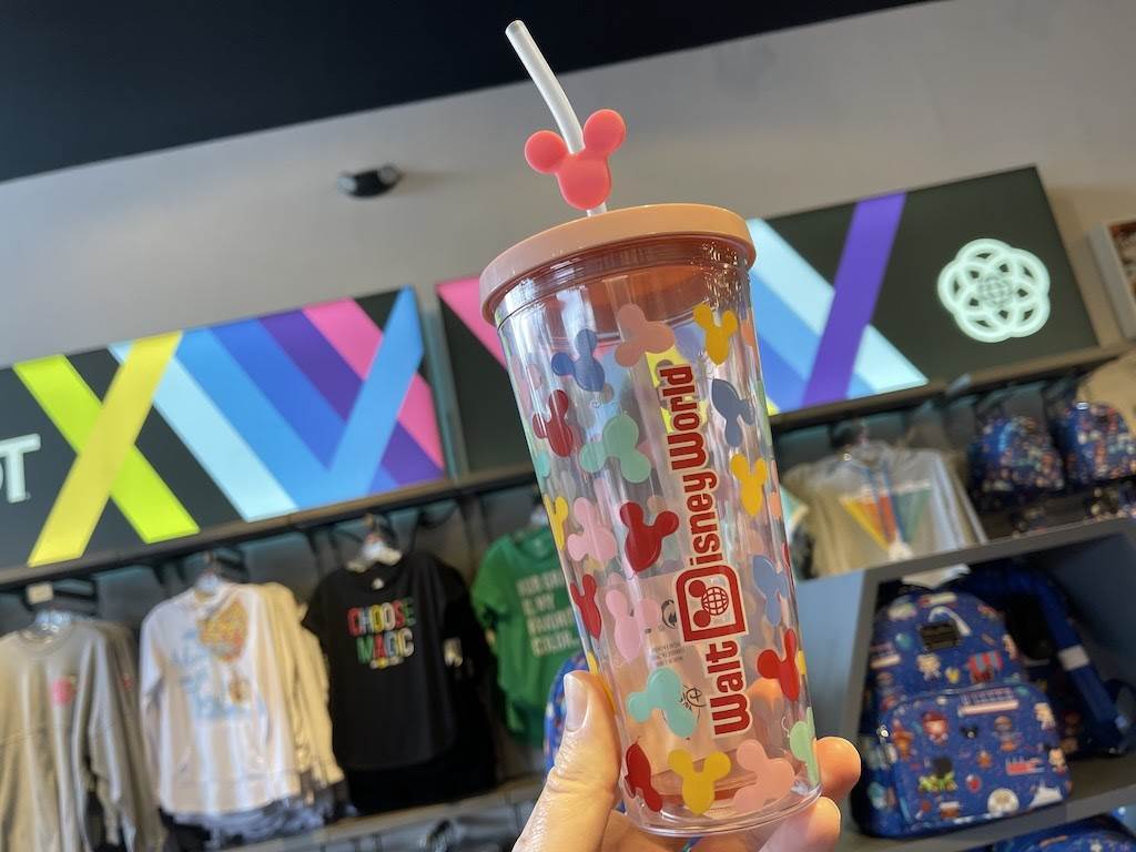 One of our favorite souvenirs available to guests are colorful Mickey Mouse balloons. This clear tumbler has several balloons “floating” along the outside of the cup along with the original Walt Disney World logo, but the real winner here is the balloon clip attached to the straw.