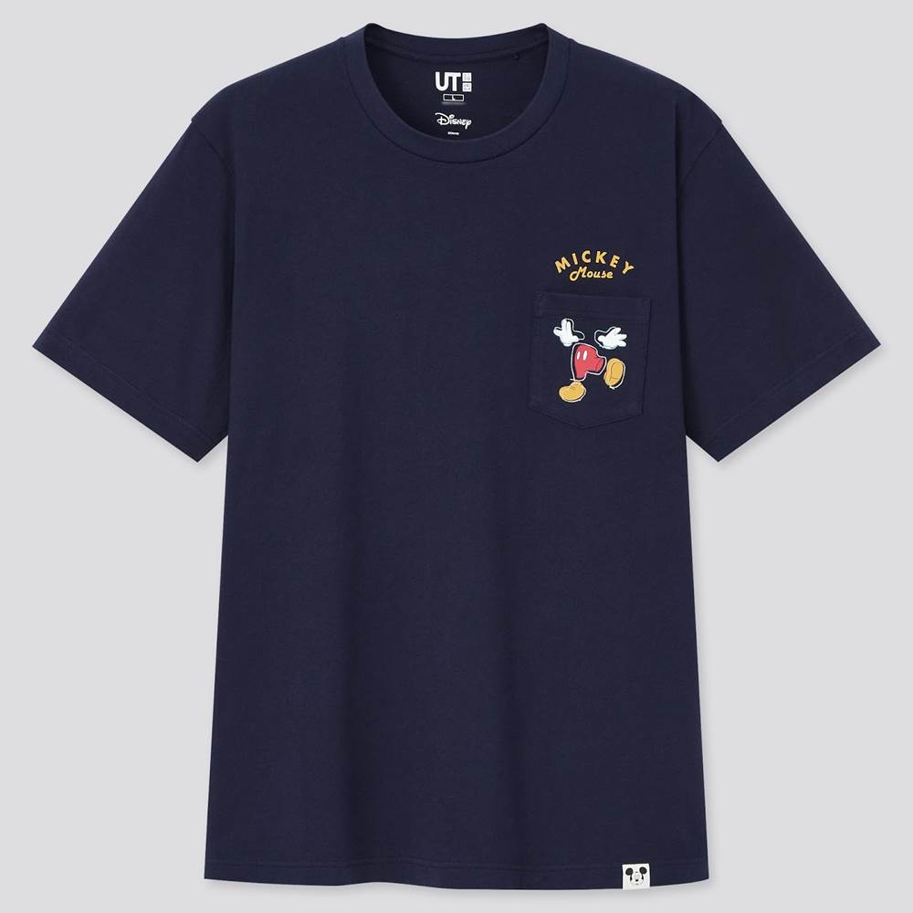 The last item in this collection is a navy blue pocket tee. Mickey’s name is spelled out above and his clothing icons are grouped together on the pocket itself.