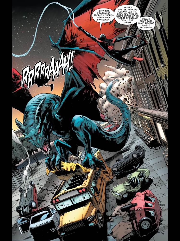 This panel is great for so many reasons. First, we’re finally seeing Miles swing into the fight against an enemy with whom he is familiar. Second, the aforementioned great quip. And finally, as has been the case with all of “King in Black” and its tie-in issues, the art is great. Carmen Carnero delivers a great look for that dragon.