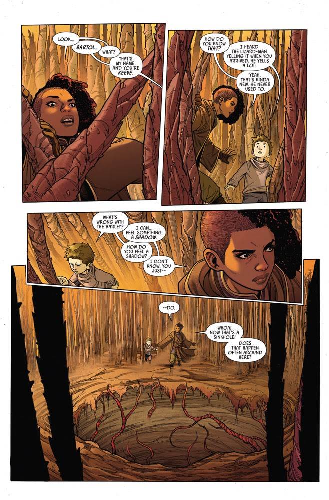 Meanwhile, Keeve interacts with the friendlier denizens of the planet, who offer food and help until their more hostile self-labeled leader Kal Sulman intervenes. Still, Tennis is determined to get to the bottom of the vashinings, so she investigates on her own, finding that the crops have been failing and rotten in the fields. A young boy joins her on her quest and they wind up at the bottom of a pit leading to a series of underground tunnels, where they encounter-- SPOILER ALERT-- the sentient dark-side plant monsters known as the Drengir (see last month’s novel Star Wars: The High Republic - Into the Dark by Claudia Gray for more information on this menacing new threat). The Drengir have drained the life from another local youth and are in the process of doing the same to Ceret when Keeve begins to put up a fight.