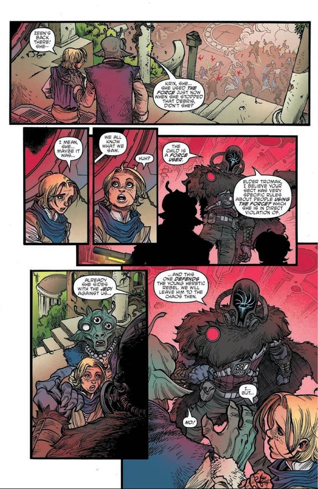 By the end of issue #2, Krix has left the planet with the Nihil and his Gran mentor Elder Tromak as they attack a Republic medical frigate, and the Padawans and their masters return to Starlight Beacon with Zeen in tow as a potential new recruit. It’s a zippy development and a welcome amount of story progress in an arc that I had first assumed would entirely take place on Trymant IV. And once again the art by Harvey Tolibao, Pow Rodrix, and colorist Rebecca Nalty match the spirit of what the writer is trying to do with this series-- namely deliver a fun, easily accessible story that breezily ties in with what the rest of The High Republic team is doing in other comics and novels. I can only guess we haven’t seen the last of Krix and his interaction with the Nihil, and I’m looking forward to seeing how Zeen adjusts to her newfound family among the Jedi.
