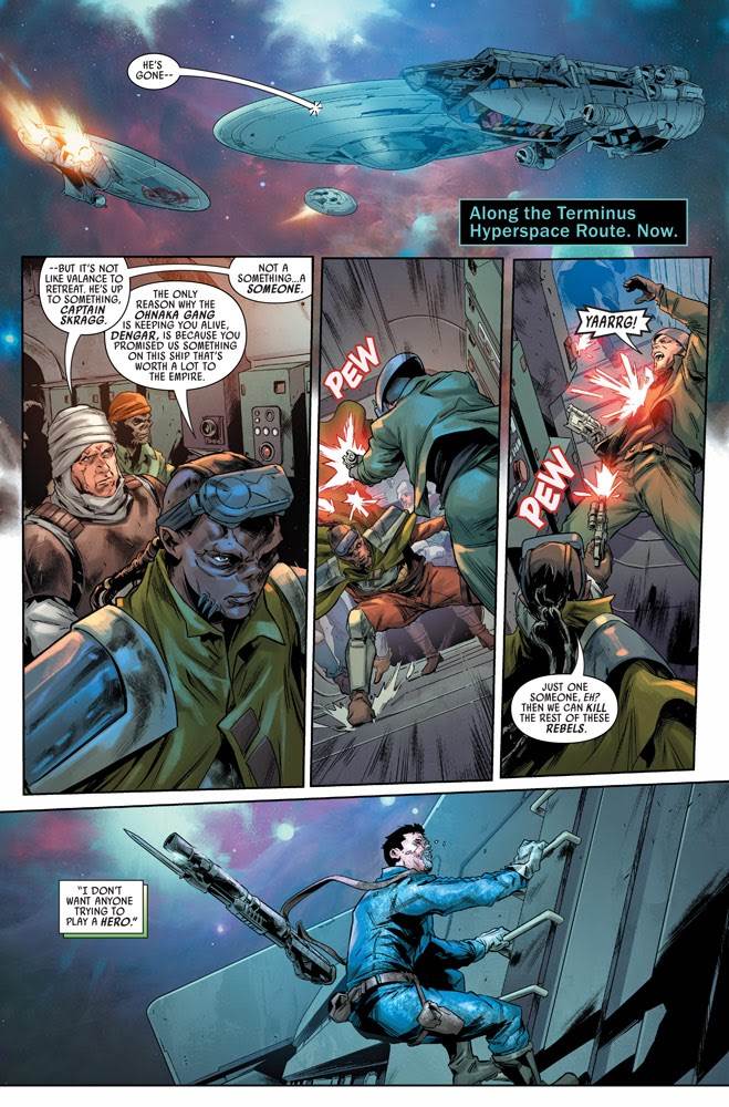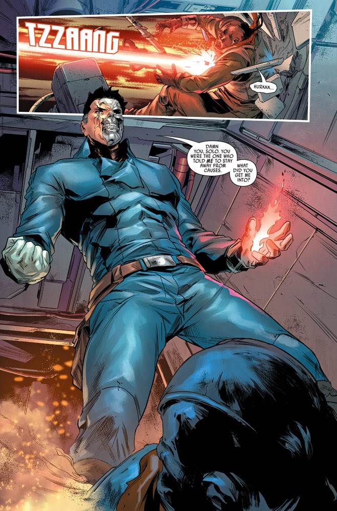 The issue-- which represents Part 3 of “The Terminus Gauntlet” arc, subtitled “A Desperate Gambit”-- opens with another flashback to Valance’s time as an Imperial cadet, or more accurately the end of that period in his life. We learn that the now-cyborg future bounty hunter was actually fairly appreciative of young Han Solo’s attempt to save his life, though Solo doesn’t stick around long enough to hear him give thanks. Cutting back to the “present” (set between the events of The Empire Strikes Back and Return of the Jedi), we see Beilert clinging to the exterior of the rebel ship, before breaking inside and taking out the space pirates one by one, John McClane-style. Meanwhile, we get an update on the status of the recovering T’onga and her girlfriend Losha, who vow to avenge the death of their friend Nakano Lash, who died in a spaceship explosion after a confrontation with Boba Fett five issues back. Plus, we get to know some of the rebel soldiers helping Valance clear out the gang, find out why Dengar is being held captive, and see Beilert’s reaction when he finds out what happened to Han Solo at the end of Empire. Seems like everyone is about to enter into pursuit of a certain Mandalorian-armored bounty hunter in upcoming issues.