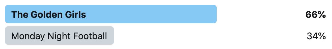 Before we move on to today’s matchup, let’s take a look at our last result. In our last contest, The Golden Girls defeated Monday Night Football to move on to the elite 8.
