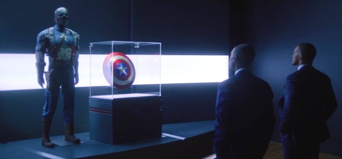 The first episode opens up with Sam at home, preparing for some kind of formal affair. As he picks up Captain America’s shield, we hear the exchange between him and Cap from Avengers: Endgame, during which Cap passed the shield on to Sam.
