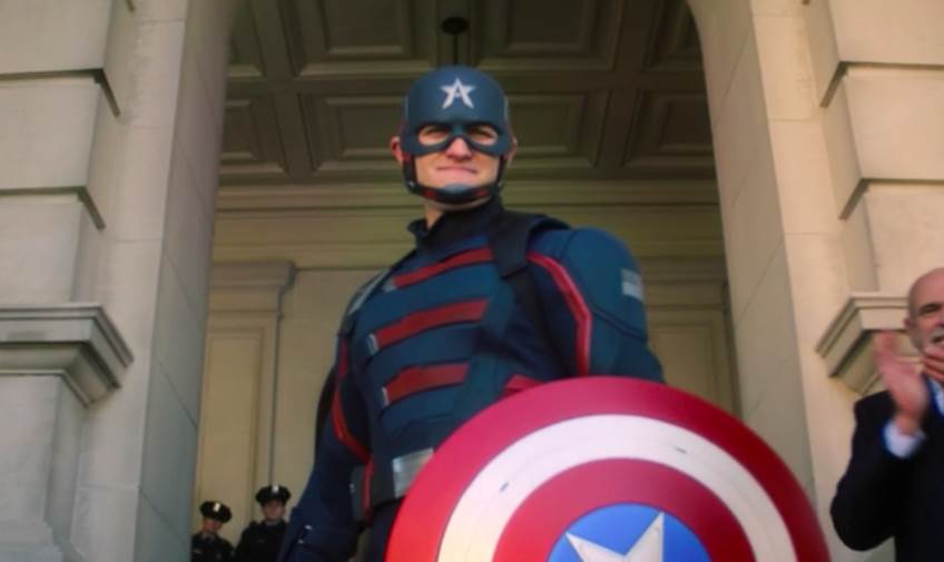 Sam’s call is interrupted when Sarah enters and tells him he needs to watch something. She turns on the TV where we see the man who thanked Sam for handing over the shield at a press conference. The man explains the need for a hero who defends America and announces that there is a new Captain America. A man enters holding the shield and wearing an altered Cap uniform. This man is John Walker, played by Wyatt Russell, who briefly held the title of Captain America in the comics before taking up the name U.S. Agent.