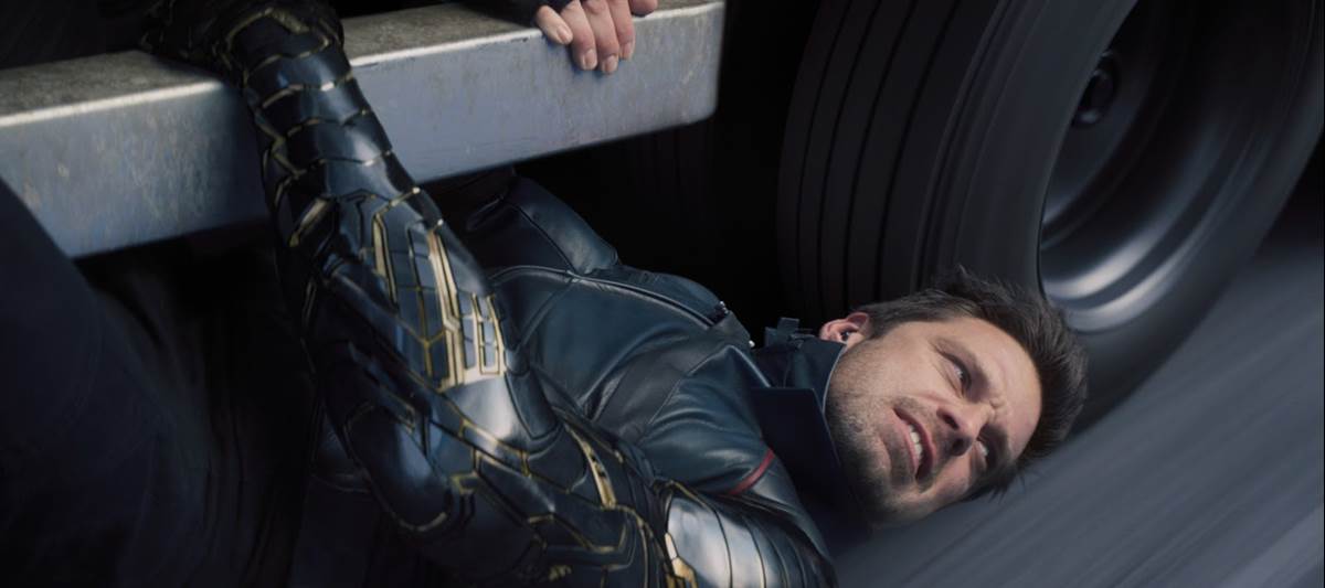 The two find a building where the Flag Smashers are loading up a truck. Sam is very tactical in hs approach while Bucky wants to rush in and start the fight. After nearly blowing their cover, the two heroes watch as the Flag Smashers load up two trucks with what appears to be a hostage in one and drive off.