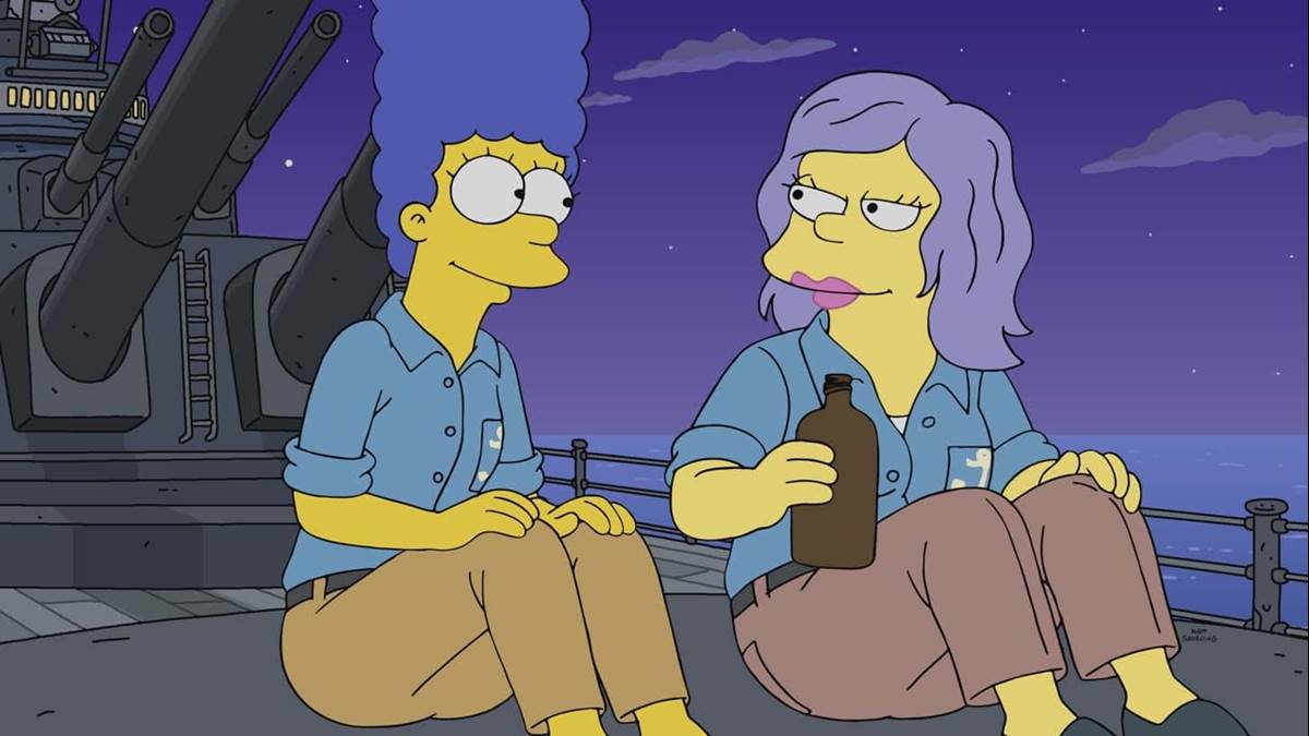 On the battleship, Marge is partnered up with Sarah Wiggum (guest star Megan Mullally), who is painfully dull in her responses to Marge’s attempts at socializing with her. At the concert, Homer and Carl bond with Chief Wiggum (Hank Azaria), who also persuaded his wife to attend the field trip. Marge continues to try to make friends with Mrs. Wiggum: “What are your top ten ways of trying to start a conversation?” Marge is surprisingly impressed with Sarah’s parenting skills and is taken aback when Wiggum lets loose after drinking some alcohol. They talk about their husbands as they wind down after the children have gone to bed, relating to each other over how similar their lives really are. Marge asks Sarah to hang out more often, but Sarah says she has a reason she keeps to herself. Suddenly two mysterious figures appear out of the darkness and put pillowcases over the two women’s heads.