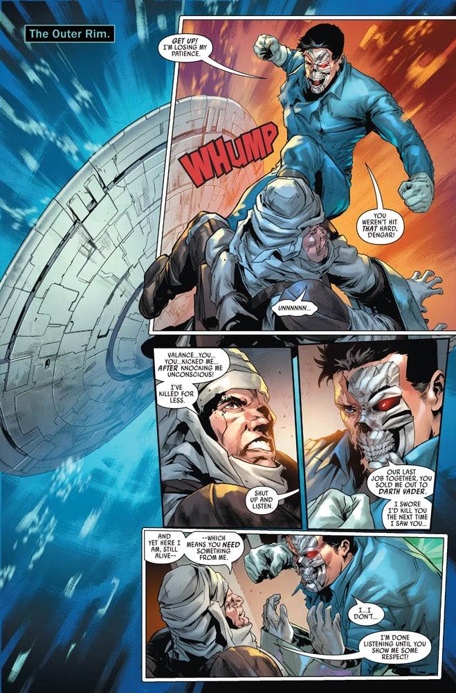 Enter Star Wars: Bounty Hunters #11, out today, which sees Dengar reluctantly teaming up with his captor Beilert Valance to track down their mutual competitor Boba Fett, who has recently taken the carbonite-frozen Han Solo aboard his ship the Slave I. As we’ve learned in flashbacks over the last couple issues (and in the Han Solo: Imperial Cadet miniseries from a few years back), Valance owes Solo a favor, and he’s evidently intent on paying it back by rescuing the smuggler from the clutches of the deadly Fett and his boss Jabba the Hutt.