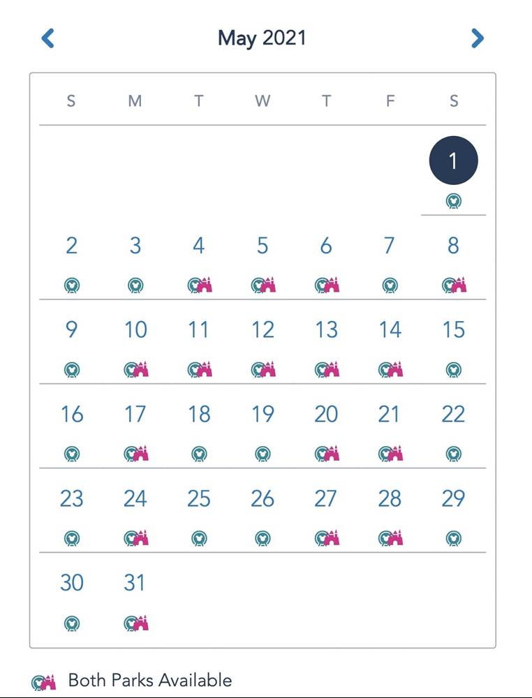 Taken to a screen where you’re presented with ticket options, I recommend clicking “View Calendar,” which opens a new window that shows you which parks are available which days. It uses icons to represent Disneyland and Disney California Adventure. If only one park is available and you’re using a park hopper, you can move to the other park after 1:00 pm.