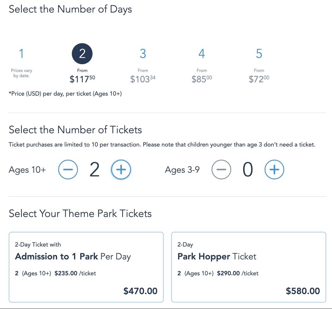 The demand-based pricing disappears when adding extra days, which then presents you with a more simplified view of the number of tickets and how much it will cost with or without the park hopper add-on.