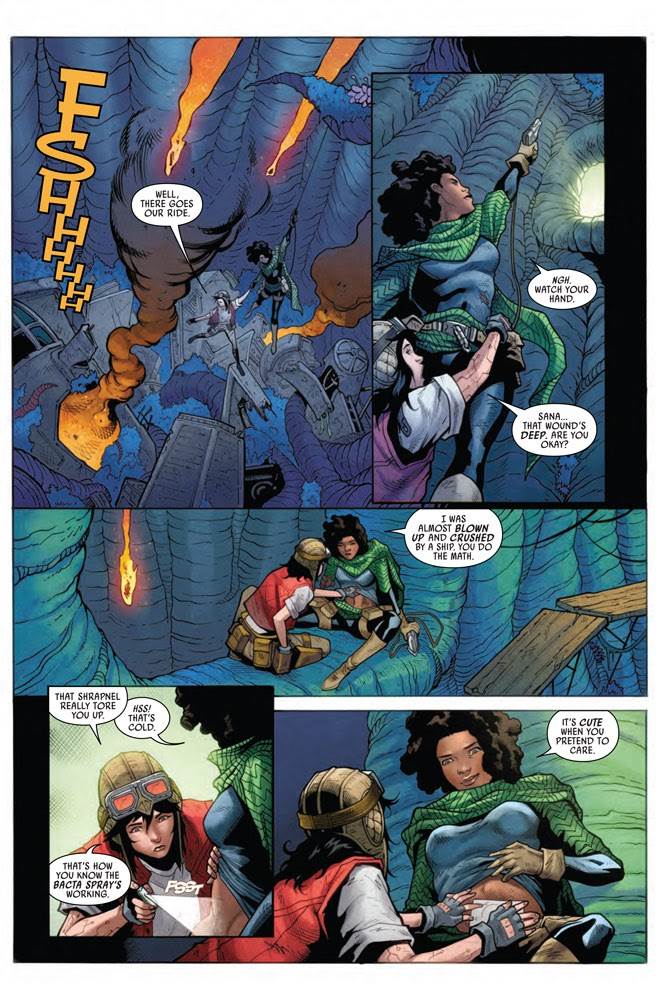 Doctor Aphra #9 starts off well enough, with Chelli and Sana escaping their predicament, discovering Vukorah’s wrathful massacre at the local cantina, and making their way to someplace called Midarr, where De’Rruyet Industries is set to show off its own repurposing of the Nihil Path Engine tech. To break into the facility, the two ex-lovers knock out a pair of interns fetching coffee (called “caf” in A Galaxy Far, Far Away) for the company’s temperamental founder Beol De’Rruyet and take their clothes. Of course they’re not recognized as imposters by any of the guards or De’Rruyet himself upon entering the laboratory, which I found to be a tad bit on the implausible side of things. I would think Aphra (and otherwise talented writer Alyssa Wong) would be able to come up with a cleverer plan, or at least one that doesn’t feel quite as hackneyed.