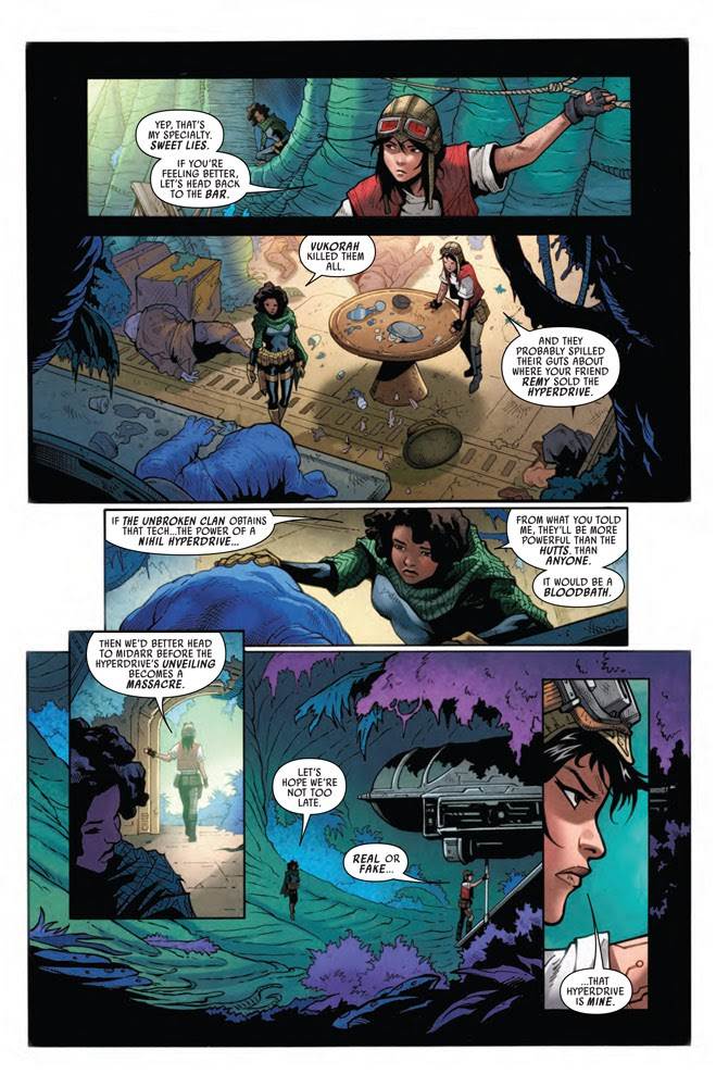 Issue #9 of Star Wars: Doctor Aphra volume 2, entitled “The Engine Job - Part 4: Impossibilities,” picks up where the previous installment left off, with the titular rogue archaeologist Chelli Lona Aphra and her ex-girlfriend Sana Starros stranded on the planet Dol’har Hyde thanks to an ambush by the Unbroken Clan’s General Vukorah. Aphra and Starros are searching for ancient hyperdrive technology left over from the High Republic era, but unfortunately just about everybody else in the galaxy seems to be after it as well.