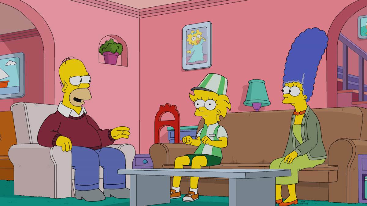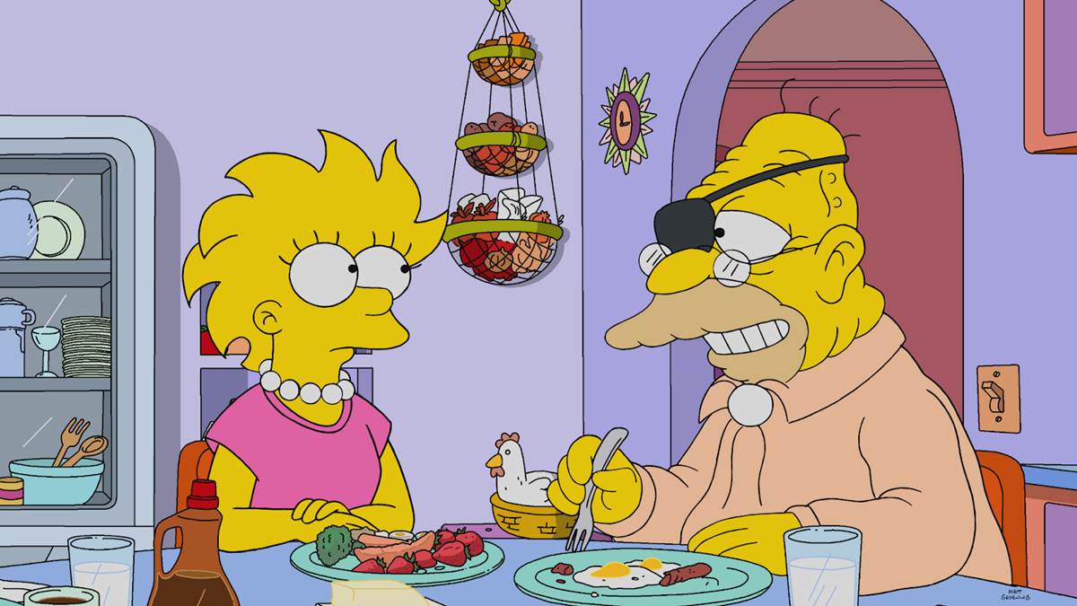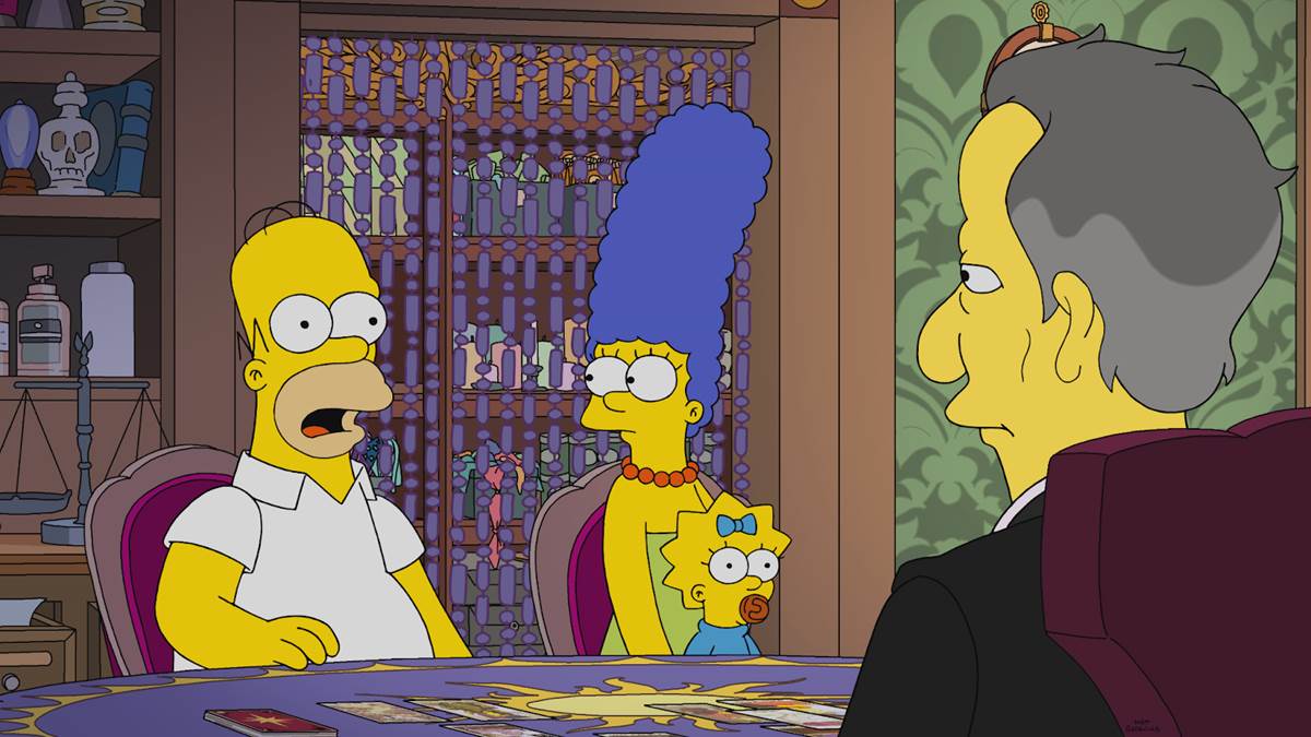The episode begins with the Simpson family entering into a magic shop run by Werner Herzog (in his fourth appearance on the show), who offers to show them the future via tarot cards. “Good news, Homer. In the future you stop drinking… and the boy becomes a fine person.” The magician predicts “years of trouble between Marge and Lisa” beginning when Lisa (voiced by Yeardley Smith) decides where to go to college. We flash forward to the future, where Marge (Julie Kavner) wakes a teenage Lisa up proclaiming that Lisa will be the first Simpson to ever finish college. In the kitchen, Marge 3D prints a stack of pancakes and a one-eyed Grampa Simpson (Dan Castellaneta) says he’s counting on Lisa to find a cure for every disease that might kill him.