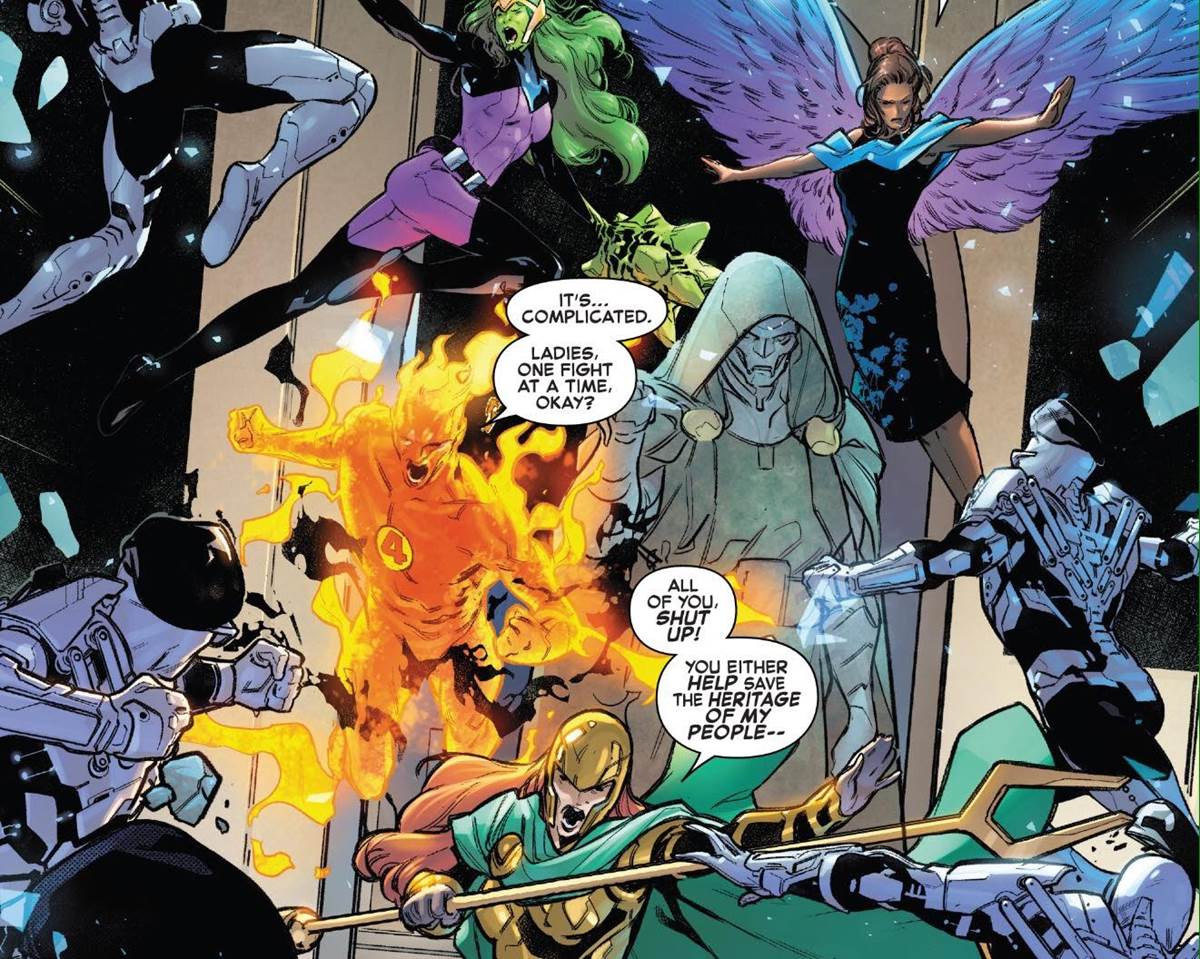 After returning from their latest adventures, Johnny Storm and Sky try to enjoy a double-date with the Thing and Alicia. Oddly enough, they choose to check out an exhibition of Latverian artifacts, overseen by Zora, Doom’s right hand. This comes after Crystal warns Johnny of his complicated past and how it can make things difficult with Sky. And boy, was she right?
