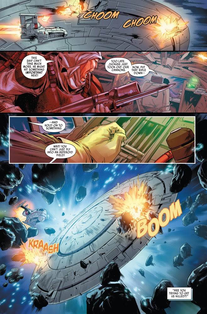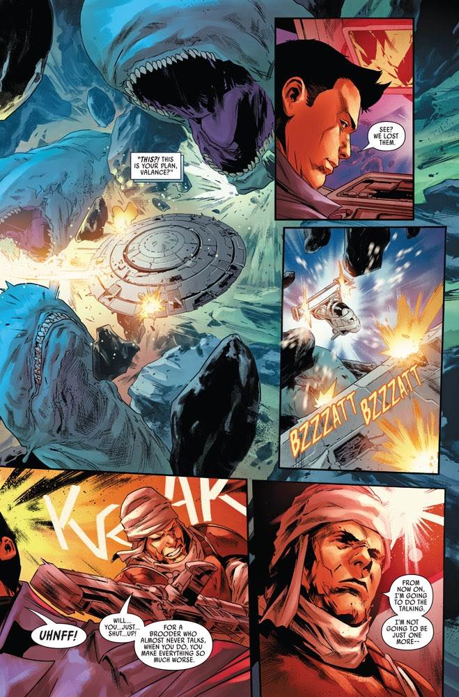 Star Wars: Bounty Hunters #12 opens with protagonist Beilert Valance hurtling through space with his unlikely traveling companion Dengar, the two of them having made an uneasy alliance thanks to their mutual desire to track down Boba Fett. Early on in the issue, they’re ambushed by fellow hunters 4-LOM and Zuckuss, who had given Valance a head start to escape after their previous encounter. During the ensuing scuffle between these four competitors across two ships, Beilert flashes back to another encounter he had with Han Solo-- some time after the Corellian scoundrel had saved his life in the Imperial Academy. It seems Valance had once been enlisted by a merciless gang called the Caviness Thorn Crew to assassinate Solo on the planet Abregado-Rae. At this point Beilert feels he owes a debt to Solo, so he intentionally botches the hit and instead turns against the gang, but Han misinterprets the violent incident and flees with Chewbacca, thinking Valance had betrayed him anyway.
