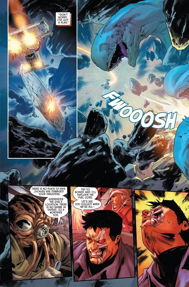 In the “present,” we see Dengar make a deal with Zuckuss and 4-LOM after knocking Valance unconscious, trading information on Fett’s whereabouts in exchange for their lives. This is all in an effort to set up the next chapter of War of the Bounty Hunters, in which all of these interested parties are likely to converge on the same location as they search for their prey. This issue has a lot going on despite not moving the plot forward a tremendous amount, and that’s largely due to the amount of time spent in the flashback, but it’s all entertaining enough for that not to matter too much. Sacks and Villainelli are still in the groove they rediscovered over the past few issues, and it’s fun to see all these different characters bouncing off each other now that so many of them share a common goal. There are some striking images here intermixed with memorable moments like Valance leading his enemies through an Exogorth-infested asteroid field and the full-page panel where he watches from below as the Millennium Falcon flies away, regretful of the misunderstanding between Solo and himself. The final page teases the return of Bossk, Bib Fortuna, T’onga and Losha in a promise that we’ll soon be seeing a lot more conflict between these combative colleagues as Star Wars: War of the Bounty Hunters continues through the summer.