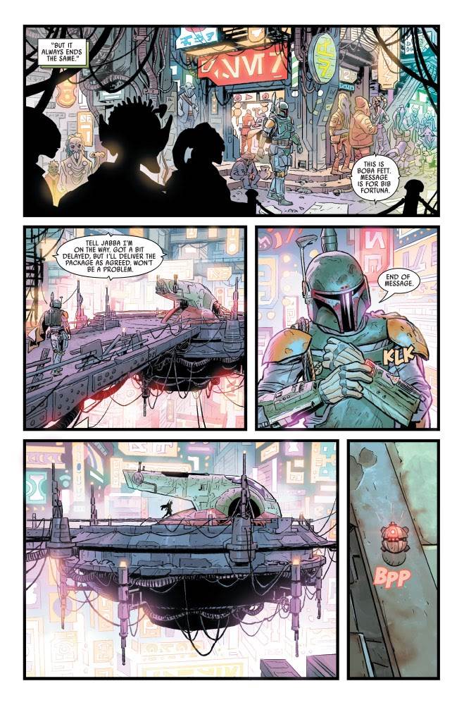 In last month’s Star Wars: War of the Bounty Hunters Alpha issue, we saw how Fett had Solo’s carbonite block stolen out from underneath him during a pit stop on the smuggler’s moon of Nar Shaddaa. And in todays #1, the notorious bounty hunter seeks to reclaim his prize from whoever took him, regardless of the danger inherent to such a task.