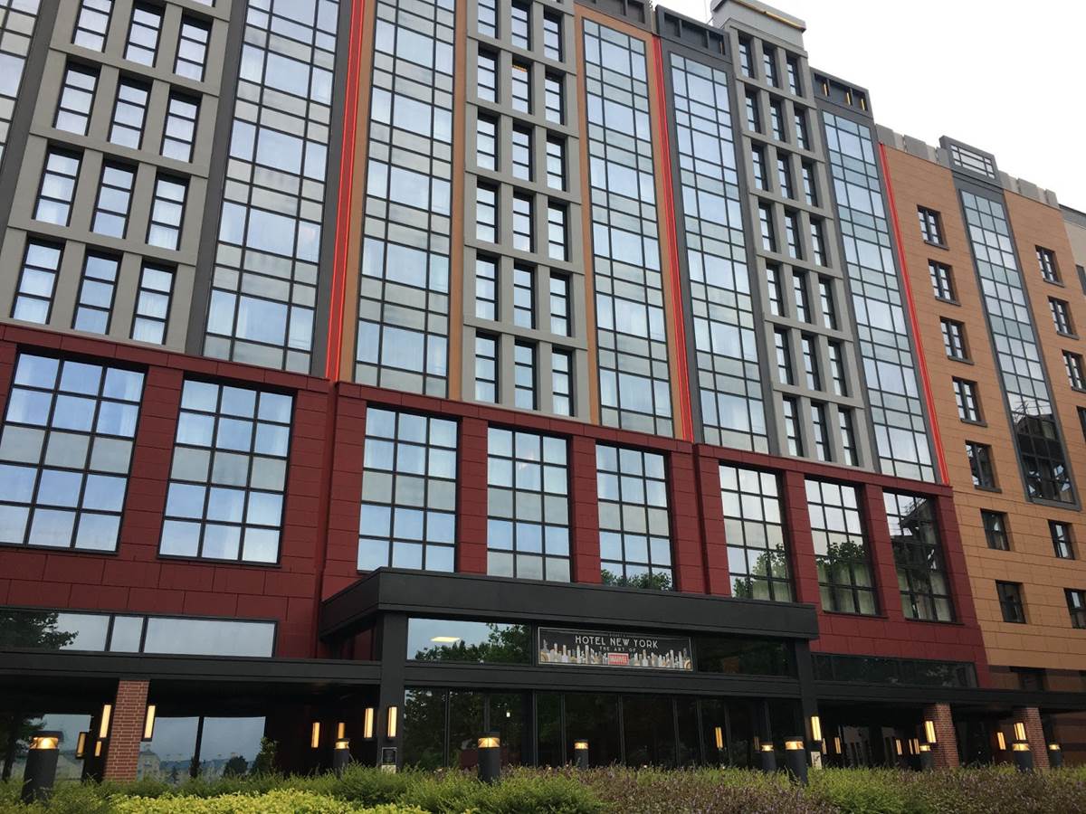 From the outside, the hotel is a brilliant take on modern New York architecture. Featuring a mirrored entrance sign and a stand-out red and grey colour scheme, it sets itself apart immediately.