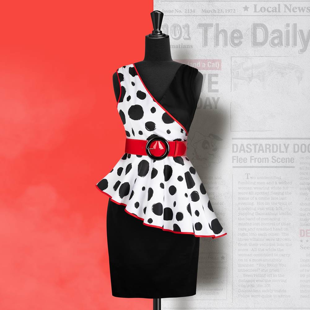 - The tailored cocktail dress features a v-neckline bringing the left and right sides together. The bottom and left side of the dress are all black while the right side shows off a dalmatian print and a flared hem accented with red piping. Cruella’s signature also appears on the left side, mid back.