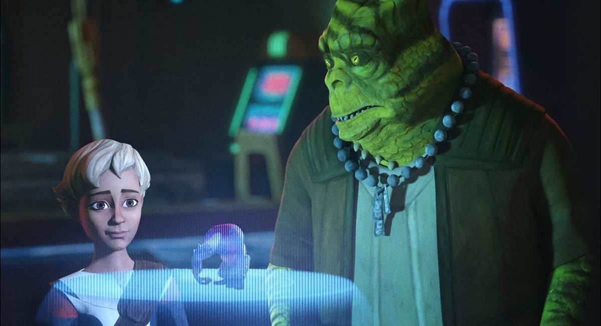 “Common Ground” begins on the planet Raxus (first seen in Star Wars: The Clone Wars) with an Imperial officer named Captain Bragg (voiced by Shelby Young from Star Wars: Forces of Destiny) addressing a gathered audience of citizens. “We promised to treat all planets within the Confederacy of Independent Systems fairly. All we asked in exchange was for your loyalty.” A senator named Avi Singh (guest star Alexander Siddig of Star Trek: Deep Space Nine) behind her bemoans privately to his droid GS-8 (Sian Clifford from Fleabag) that he is becoming a puppet for the Empire. Bragg explains that a mandatory curfew is being put into effect, to boos from the crowd. She introduces Singh for further comment, but tells GS-8 to follow his instructions if anything happens to him. The citizens react more positively to the senator, but mid-speech he changes his mind and stops backing the Imperial occupation. Bragg takes Singh into custody and orders troops and walker tanks to move in on the irate crowd. GS-8 covertly sends a message out into the galaxy asking for assistance.