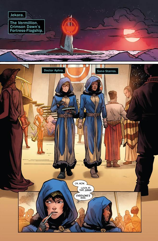 In today’s new issue of Marvel’s Star Wars: War of the Bounty Hunters miniseries, we saw rogue archaeologist Dr. Chelli Aphra and her partner in crime Sana Starros attending the auction for Han Solo’s carbonite-frozen body thrown by the crime syndicate Crimson Dawn.