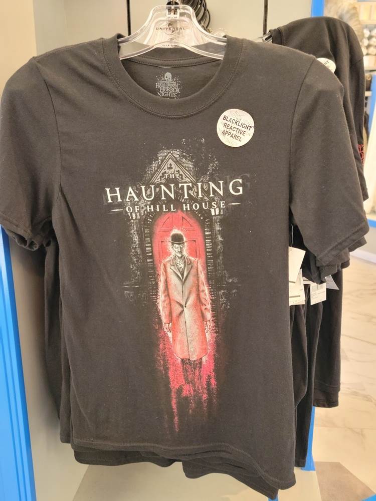 Finally, Universal has a shirt inspired by Netflix’s The Haunting of Hill House that features black light reactive material. A spooky, white-eyed man stands in front of a blood red door and we already have goosebumps! The left sleeve includes a vertical ombre event logo.
