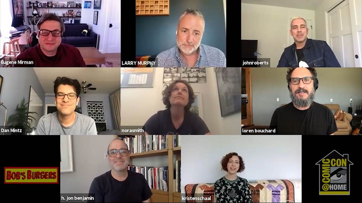 Comic-Con@Home 2021 concluded this afternoon with a panel discussion of the hit FOX animated series Bob’s Burgers, featuring creator Loren Bouchard, executive producer Nora Smith, and cast members H. Jon Benjamin (voice of Bob Belcher), John Roberts (Linda Belcher), Kristen Schaal (Louise Belcher), Eugene Mirman (Gene Belcher), Dan Mintz (Tina Belcher), and Larry Murphy (Teddy).