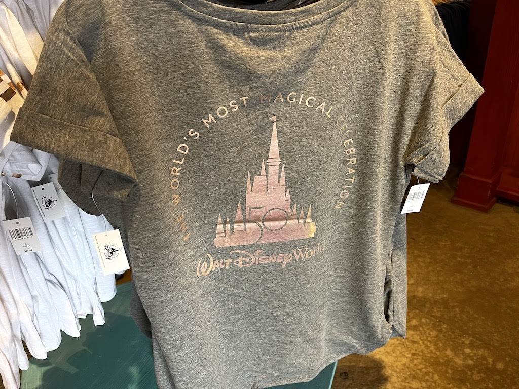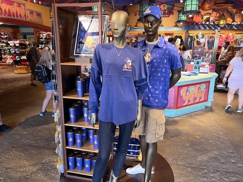 Fans can also shop a selection of white and blue t-shirts that feature gold or iridescent foil Mickey Mouse and special anniversary tags. There’s also a grey shirt with a small Mickey on the front and a large Cinderella Castle icon on the back. Shirts are priced between $24.99-$39.99.