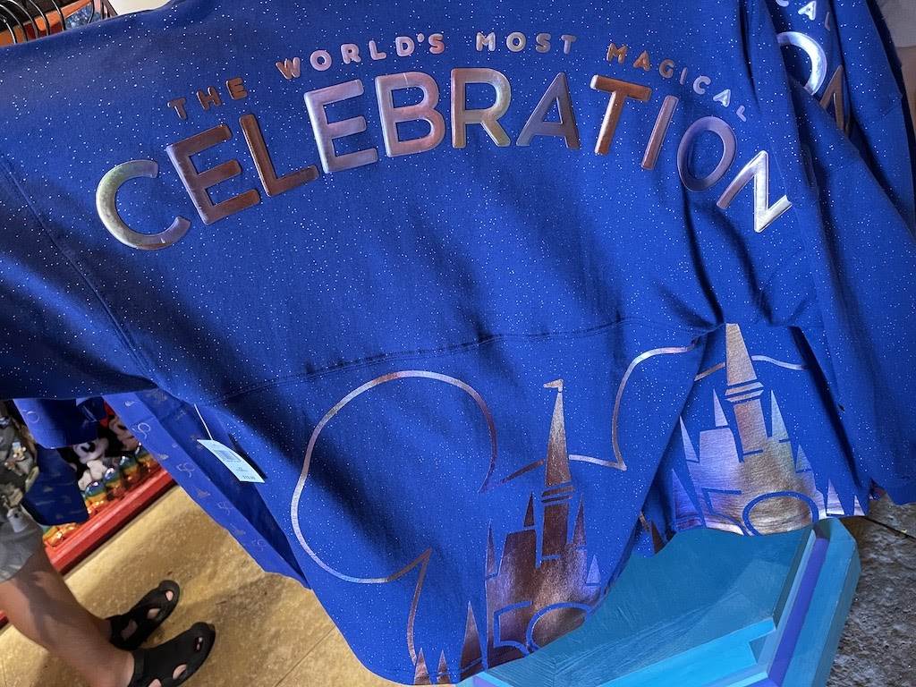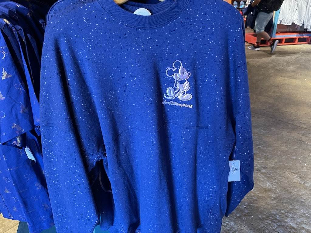 For fans of this oversized, ultra comfy shirt craze here’s another design for your collection! The royal blue shirt is dotted with sparkly pixie dust throughout and the front side features an iridescent Mickey Mouse positioned on the left chest. But it’s the back where all the magic is taking place! The upper back extending to the shoulders reads “The World’s Most Magical CELEBRATION” in puffy iridescent letters and below it a large icon of Cinderella Castle, Mickey Ears and the number 50. The spirit jerseys sell for $79.99