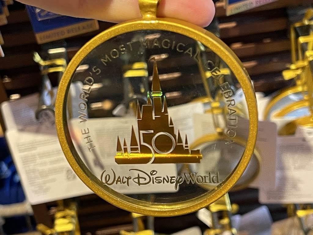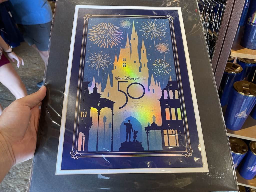 Commemorate this milestone anniversary with a lovely framed lithograph of Cinderella Castle, the Partners Statue and evening fireworks at Magic Kingdom. The picture also reads “Walt Disney World 50 The World’s Most Magical Celebration.” It’s available for $49.99.