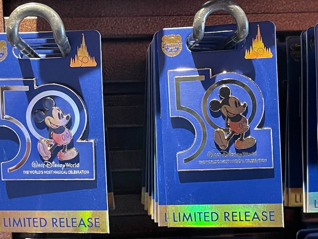 We’re in love with this Anniversary pin that showcases Mickey Mouse in one of his most iconic poses (hands behind his back, right foot out to the side) standing in front of the zero in “50.” Below him are the worlds “Walt Disney World The World's Most Magical Celebration.” The limited release pin sells for $17.99.