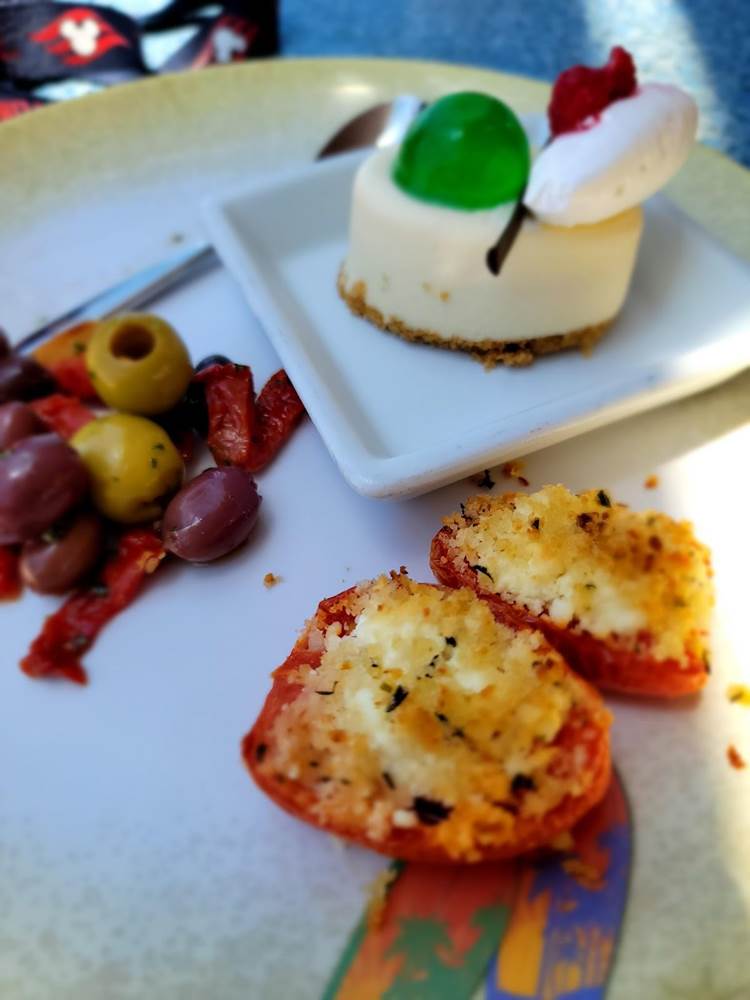 I had a snack of goat cheese stuffed tomatoes, olive tapenade and a key lime cheesecake. Disappointed by the cheesecake I snuck off to Vanellope’s to pick up a couple of cupcakes to enjoy later back in the stateroom. While Gideon hit the Mickey Slide a few more times before drying off for his next reserved slot at the Oceaneer Club.