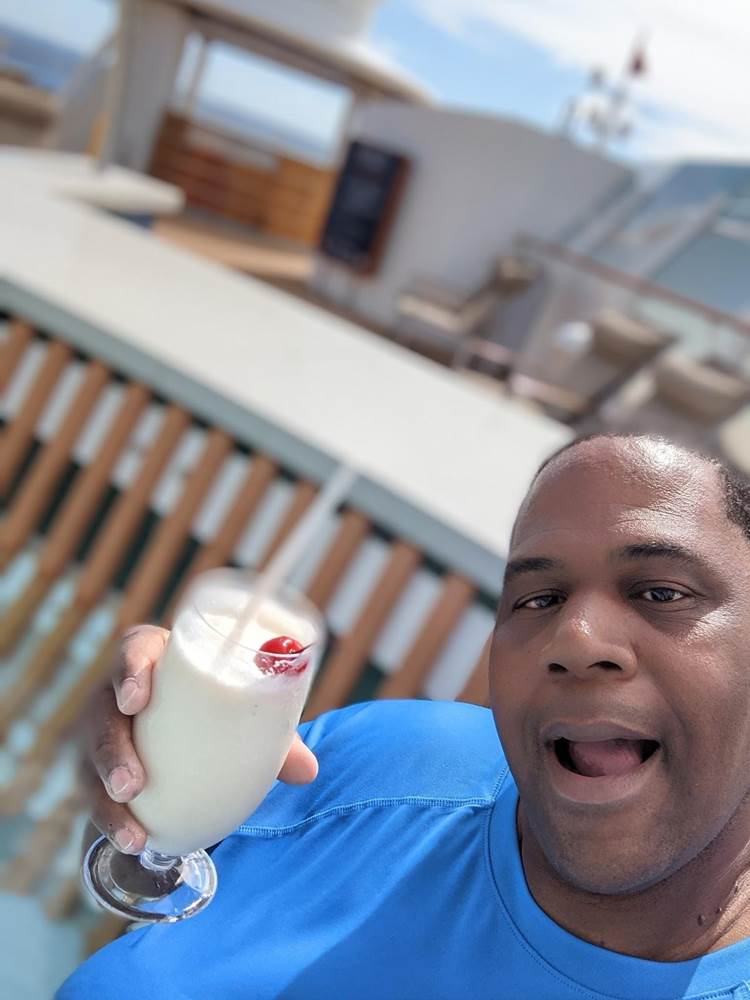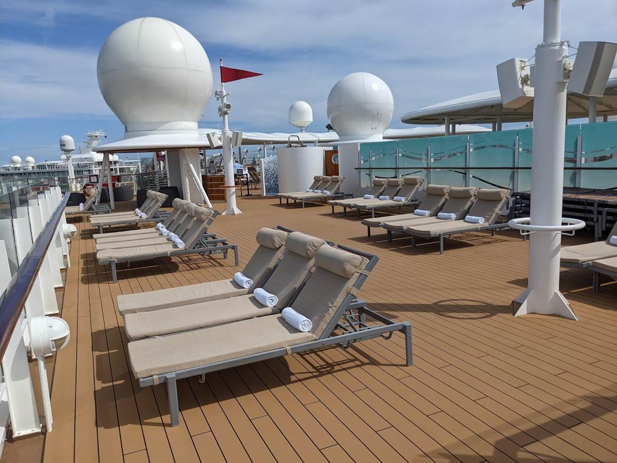 As Gideon enjoyed his kids club time, Doobie and I lounged by Satellite Falls. Doobie ordered the non-alcoholic drink of the day and made friends with others relaxing. Something I’ve noticed is Satellite Falls seem to be only “falls” when in port I’m guessing due to the ocean breezes when at sea. Also, notice the rolled up towels on each chair. This is to enable you to select a towel without touching a bunch of others. On previous cruises we would simply reach into a bin and select the towels needed. On this cruise those bins were locked and the staff was busily placing rolling and refilling empty spots with a towel so they were easily available in all the upper deck areas.