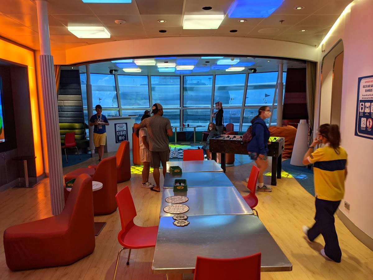 “C’mon, Dad, let me enjoy my chocolate chip pancakes without a photo.” But check out that beautiful blue ocean in the background. After our top deck breakfast we stopped by the Sarge Says (Simon Says Disney style) activity and the tween hangout Edge had an Open House. I’m grateful Disney has a space for younger teens as well as Vibe for the older ones.