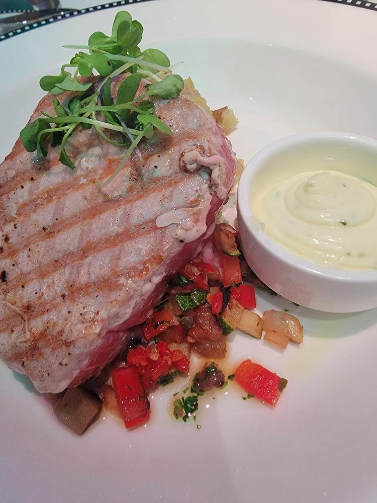 Seared Tuna Steak with fingerling confit, caponata, sun-dried tomato pesto and aioli