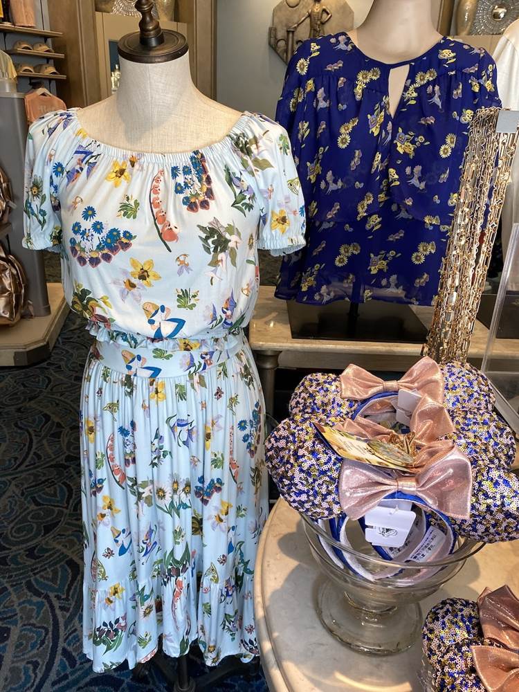 Her Universe collaborated with Disney to bring this collection to guests designing a gorgeous light blue top and skirt set and a navy keyhole blouse that’s decorated with wildflowers. There’s also a pair of pink and blue Minnie Ears topped with a metallic pink bow!